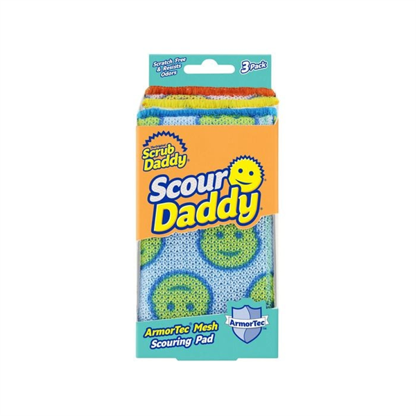 Scrub Daddy Scour Daddy is a heavy-duty, non-scratch scouring pad set designed to tackle stubborn grime in the kitchen, bathroom, and outdoors
