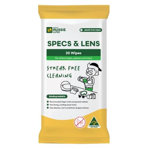 Great Aussie SPECS & LENS wipes are a non-abrasive scratch free cleaner for all lens types, glasses and visors, to help clean up and improve visual clarity