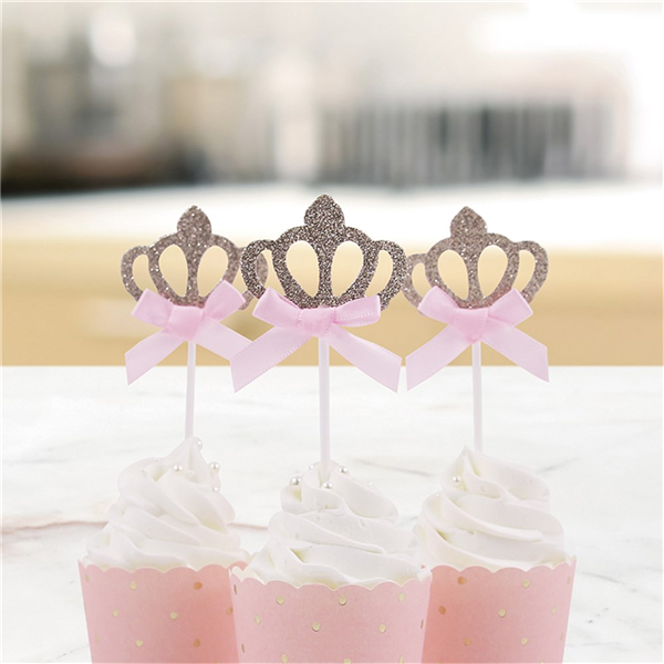 6PK CHAMPAGNE GLITTER CROWN CUPCAKE TOPPER W/PINK RIBBON-4.5CM