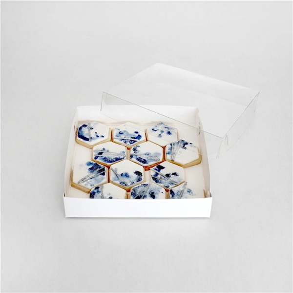 Protect and present your baked goods during transport with our LOYAL Biscuit Boxes Lid has a full transparent viewing window to showcase your biscuits Flat packed, easy to assemble boxes High quality milk board Size: 6x6x1in/15.5x15.5x3cm