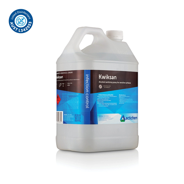 Actichem Kwiksan Hospital Grade Disinfectant 5L is a fast-acting, broad-spectrum disinfectant formulated to effectively kill bacteria, fungi, and viruses on hard surfaces