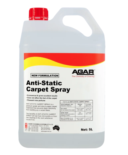 Agar Anti-static Carpet Spray 5L is a specialised treatment designed to reduce and control static electricity in carpets, rugs, and textile floor coverings