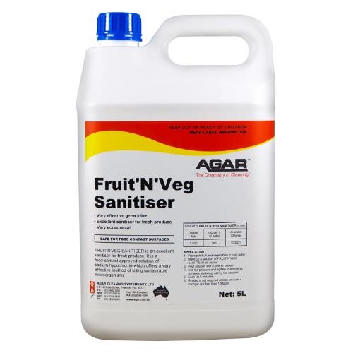 FRUIT’N’VEG SANITISER contains available chlorine which is present in the solution in the form of sodium hypochlorite and hypochlorous acid
