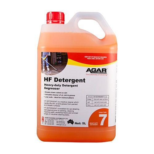 Agar HF Detergent Heavy Duty Degreaser 5L is a powerful alkaline detergent formulated to remove heavy grease, oils, fats, and stubborn soil from hard surfaces
