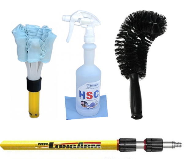 Includes a 7 m extension pole, 750 ml specialist camera cleaning solution, a soft goat-hair cobweb/dusting brush, and a set of five premium microfibre glass cloths