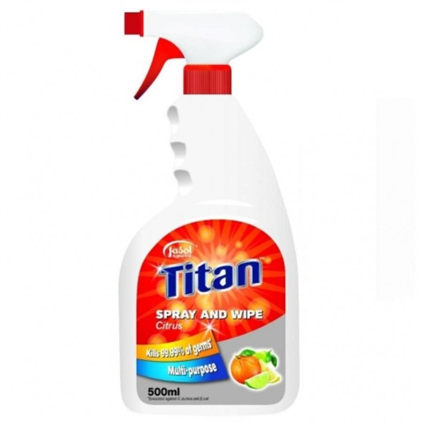 Jasol Titan General Purpose Spray & Wipe Citrus 500ml is a ready-to-use cleaner designed for fast and effective removal of dirt, grease, and everyday grime