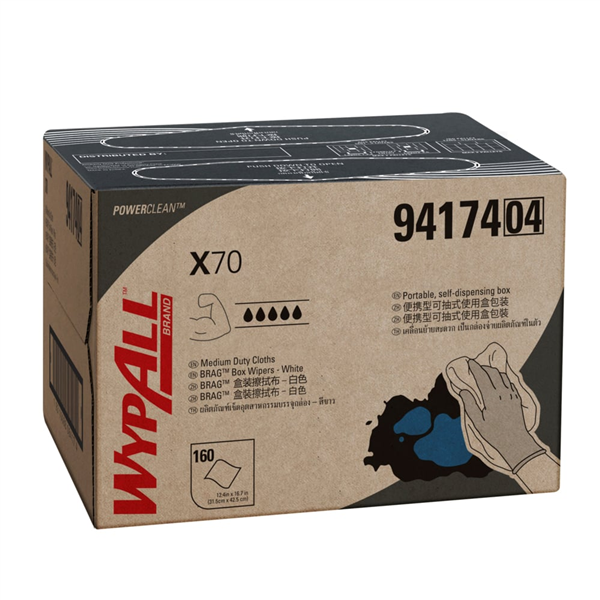 WypAll X70 Single Sheet White 160/CTN 94174 is a heavy-duty disposable wiping cloth designed for demanding cleaning and maintenance tasks