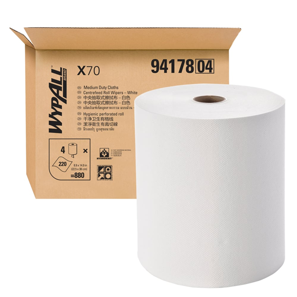 WypAll X70 Centrefeed White 220 Sheets/Roll 4/CTN 94178 is a high-performance reusable wiping cloth roll designed for demanding cleaning tasks