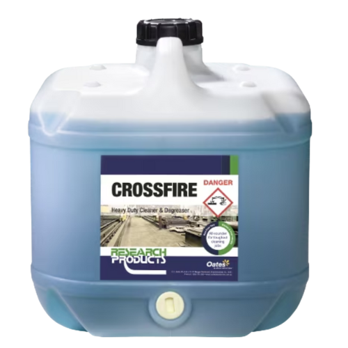 Research Crossfire is a powerful, concentrated heavy-duty cleaner and degreaser designed to cut through grease, fats, food spills, nicotine stains, waxes, and ingrained grime