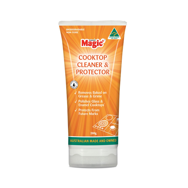 Non-scratch formula that removes food, oil, water marks and stains from glass, induction and enamel cooktops