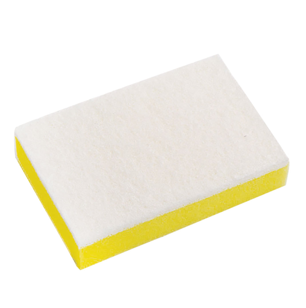 is a dual-action sponge scourer combining a soft-grade nylon/polyester scour layer with a high-absorbency yellow foam backing