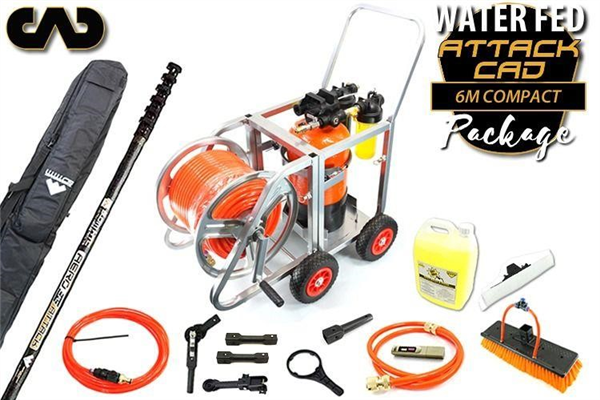 Includes BRILLIANT NEW 100% carbon, non-round Aero CAD Attack 6 m pole, 12.5 L GO H2O Pro DI on all-in-one trolley with detergent dispenser, removable compact hose reel & 80 m hose